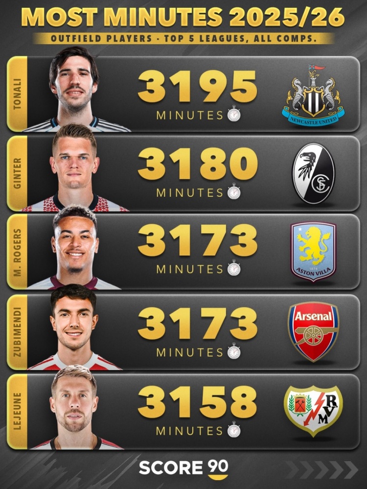 2、佳夫(纽卡):3525分钟