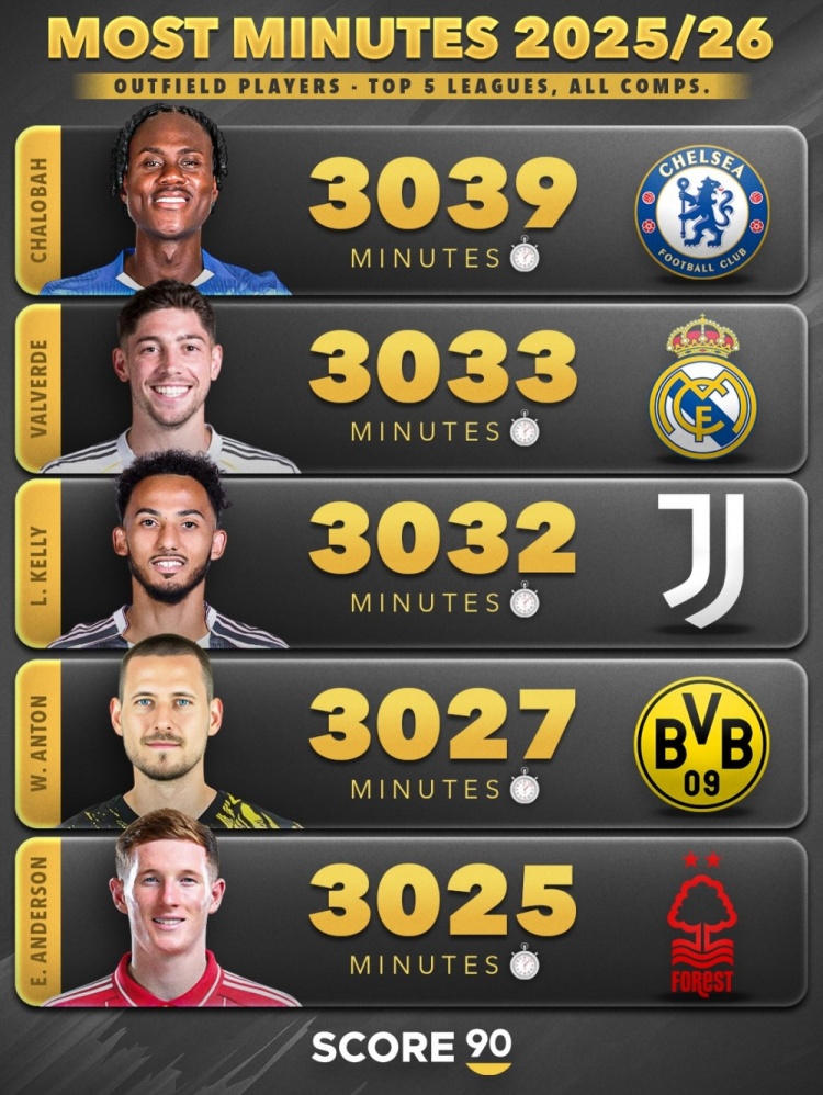 3月3日讯 Score90统计出了本赛季五大联赛迄今为止,各项赛事出战比赛时间最多的30名非门将球员,水晶宫的拉克鲁瓦以3540分钟居首,利物浦队长范戴克以3510分钟位居第三。